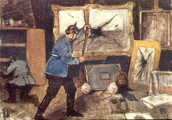 Tenslotte vermelden we nog dat Duitse militairen in oktober 1914 het atelier van Isidore Opsomer in de Rechtestraat binnendrongen en moedwillig schilderijen beschadigden. Een overgroot deel van het oeuvre van Raymond Delahaye gaat verloren. Het ouderlijk huis op de Grote Markt en zijn atelier bij de heer Marchal in de Lisperstraat gaan in de vlammen op.